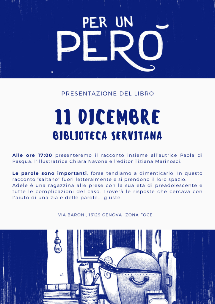 Inoltre ci vedremo anche per la prersentazione del libro “Per un Però” scritto da Paola di Pasqua ed illustrazto da me, l’11 Dicembre alla Biblioteca Servitana in zona Genova Foce… un’altra idea regalo per ragazzini preadolescenti per invogliare alla lettura e all’attenzione alle perole.